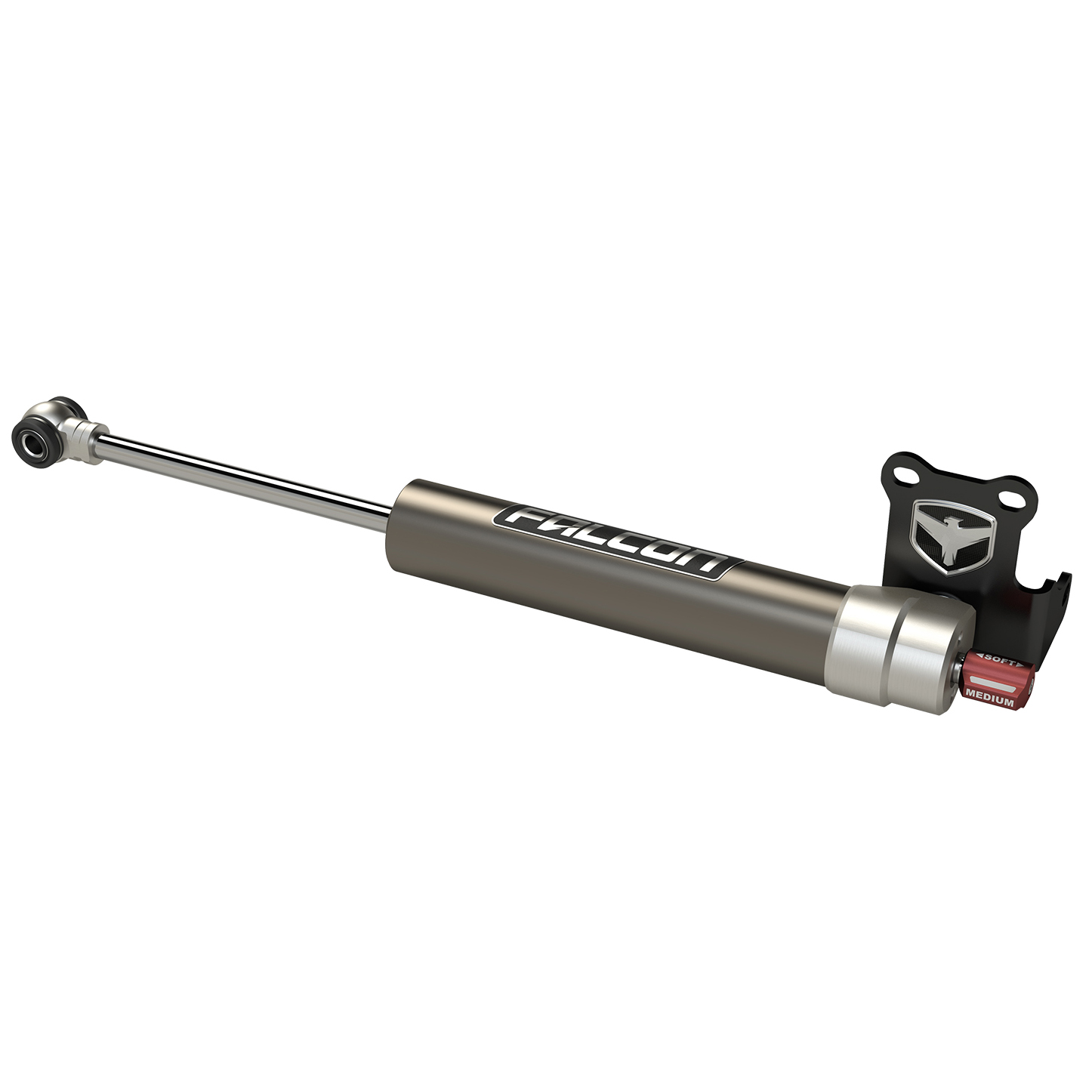 The Falcon Nexus EF 2.2 Fast Adjust Steering Stabilizer offers a wide range of adjustability with its 3-position Fast Adjust Knob. Settings include Soft, Medium, and Firm.